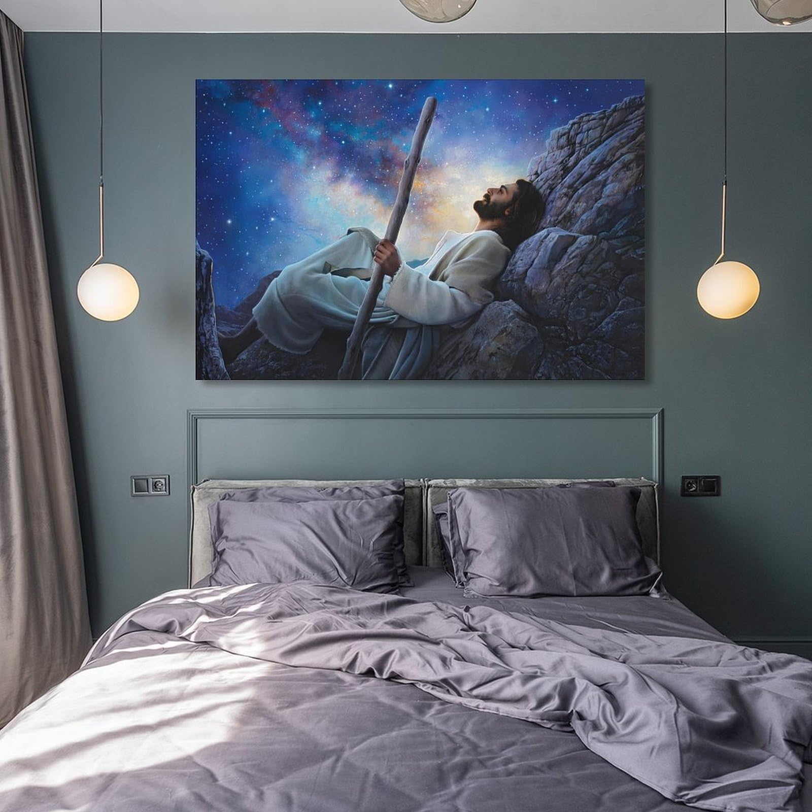 This peaceful Christian wall art depicts a serene moment of reflection under a celestial night sky. It is a meaningful addition to any bedroom or prayer room, providing a focal point for meditation and spiritual calm.